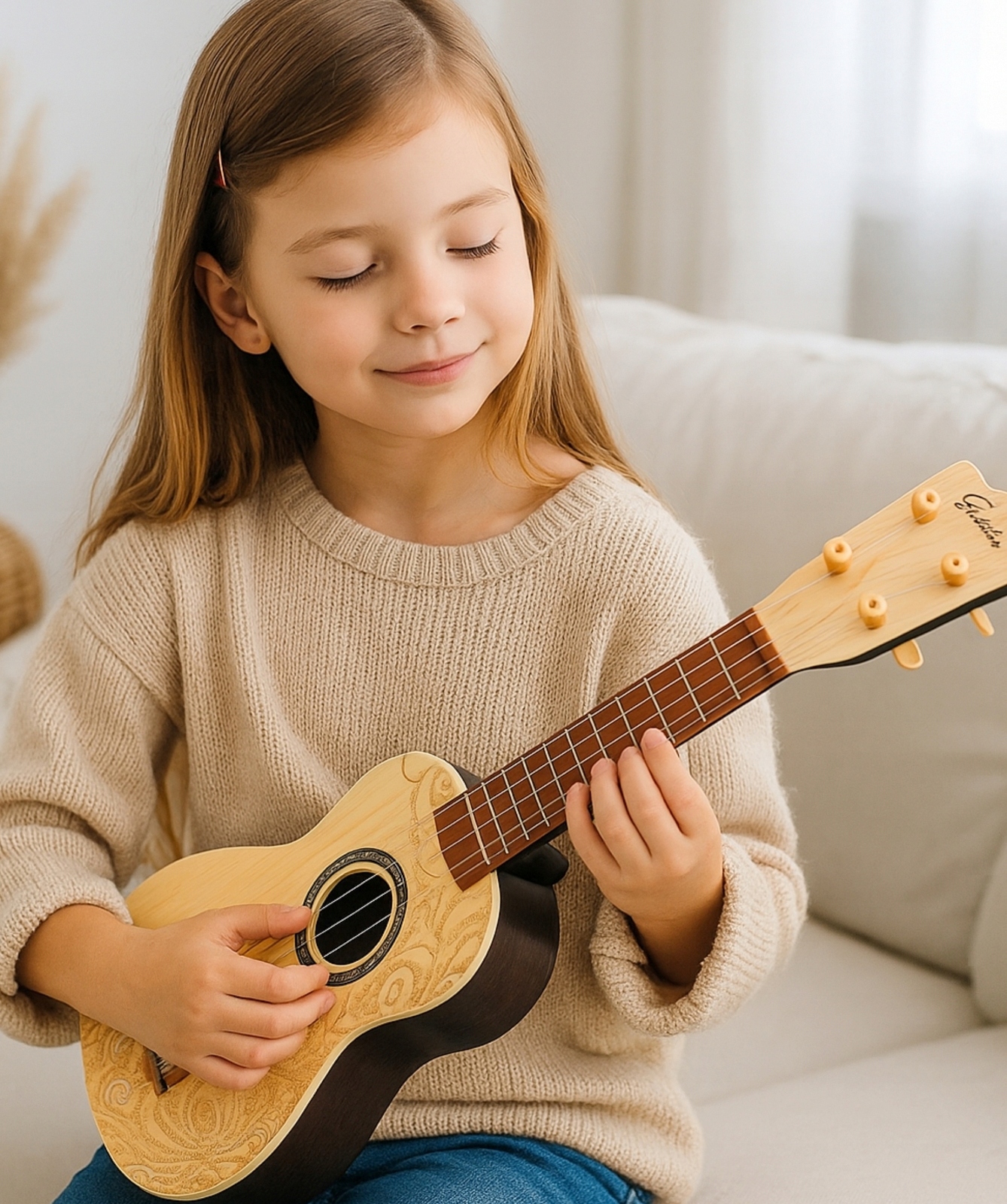 Gitara ma praktyczny i dostosowany dla dzieci kształt ułatwiający chwytanie i trzymanie. Dzięki niej dzieci uczą się rozpoznawania dźwięków a zabawa instrumentem korzystnie wpływa na poczucie rytmu. Dodatkowo zabawka pobudza kreatywność i twórcze myślenie, uczy cierpliwości i poprawia pamięć i koncentrację.