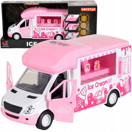 Camper dla lalek z serii Food Truck to pojazd Lodziarnia. Przestronne auto posiada otwierany bok, dzięki czemu możemy dostać się do kuchni. Autko ma kolorowe naklejki z lodami, które zachęcają do zakupów.