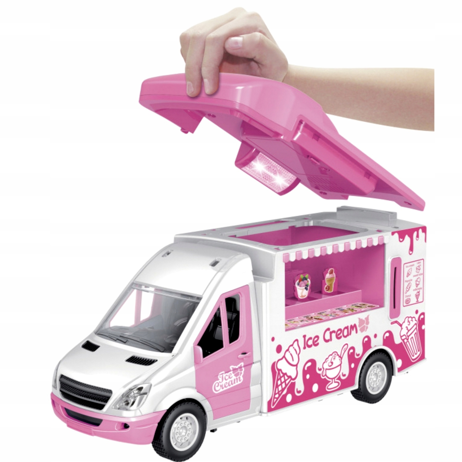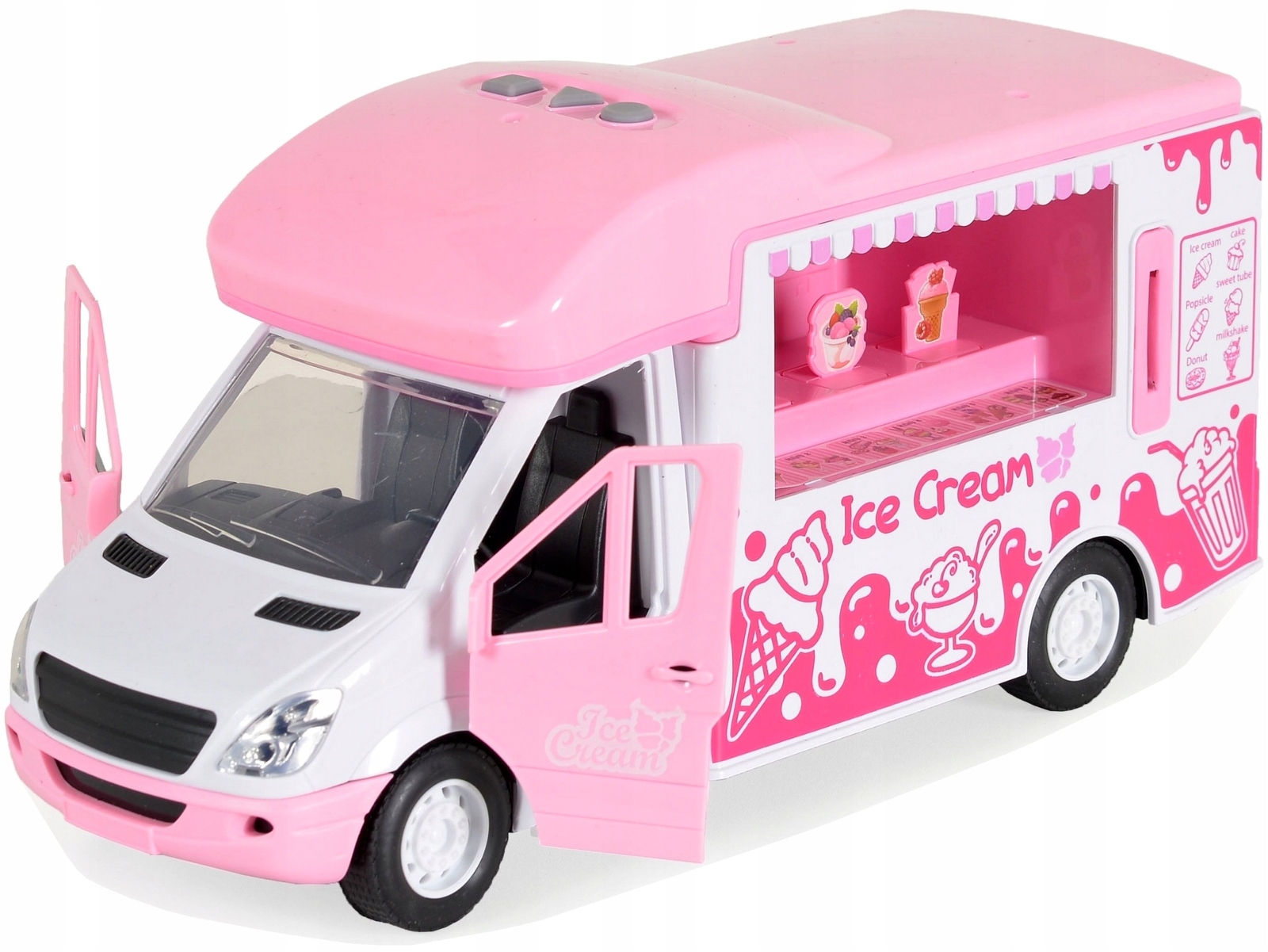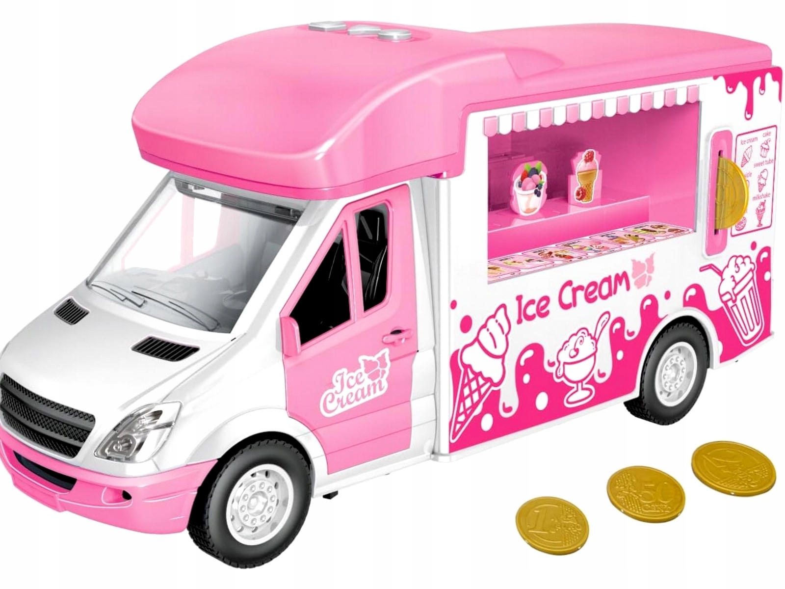 Za lody zapłacisz monetkami które są dołączone do zestawu a pod tylną klapą znajduje się miejsce na monety. Otwierane są również boczne drzwi szoferki, kamper wyposażony jest w zdejmowany dach.
