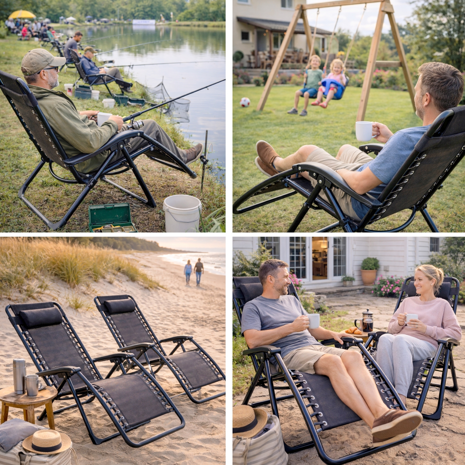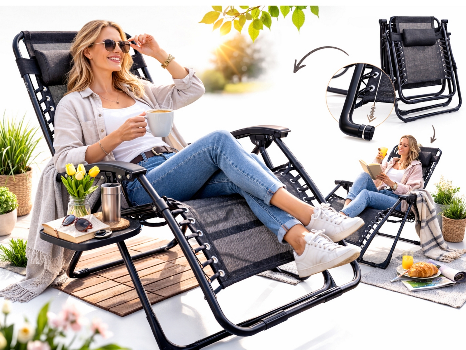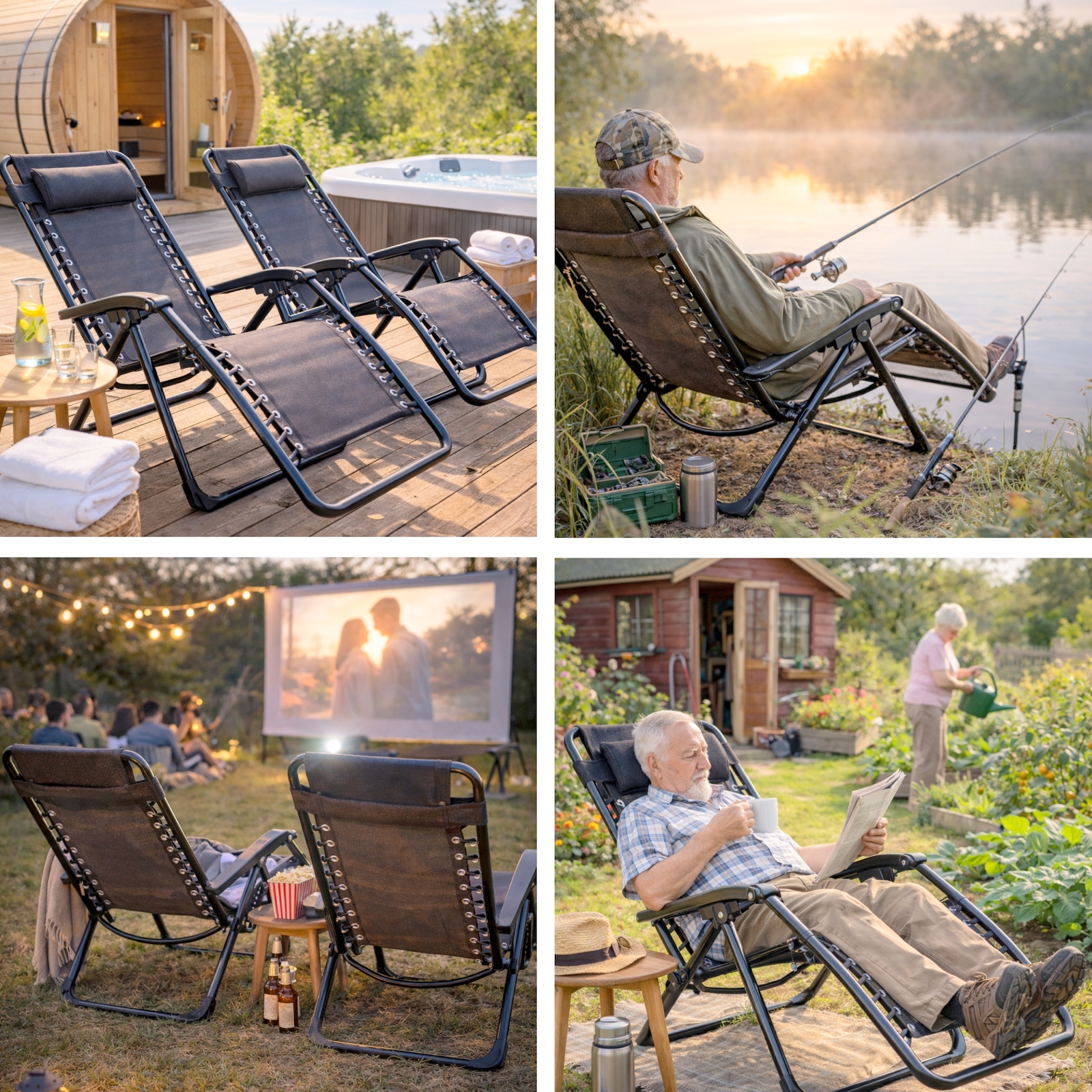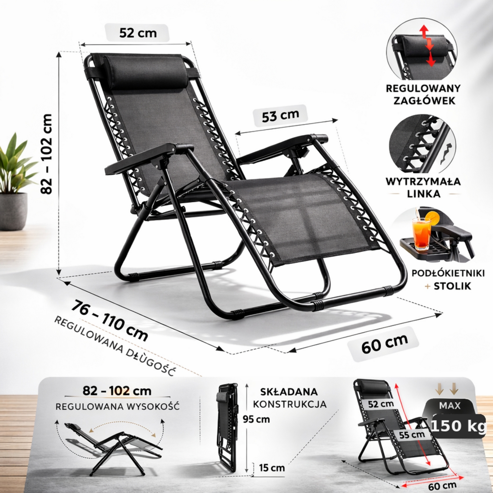 Fotel grawitacyjny sprawdza się zarówno jako stały element wyposażenia ogrodu, jak i mobilny mebel, który możesz szybko przestawić w inne miejsce — w słońce, cień lub pod zadaszenie. Jego lekka konstrukcja (ok. 6,1 kg) sprawia, że bez trudu przeniesiesz go samodzielnie – nawet z ogrodu na taras czy do wnętrza domu.