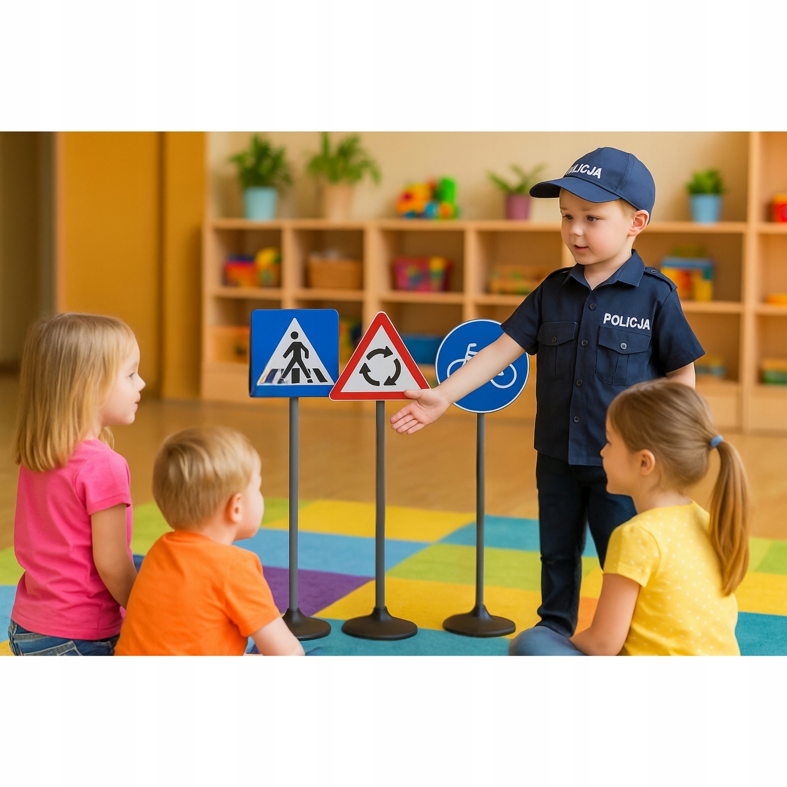 Zestaw edukacyjny znaków drogowych to doskonałe narzędzie, które wprowadza dzieci w świat zasad ruchu drogowego pomagając im zrozumieć podstawowe reguły panujące na drodze. W skład zestawu wchodzi pięć realistycznie odwzorowanych znaków drogowych: "Droga z pierwszeństwem przejazdu", "Droga dla rowerów", "Ruch okrężny", "Przejście dla pieszych" oraz "Sygnalizacja świetlna" . Każdy z tych znaków pełni ważną funkcję w edukacji malucha pomagając mu w łatwym rozpoznawaniu symboli, które są nieodłączną częścią codziennego ruchu ulicznego.