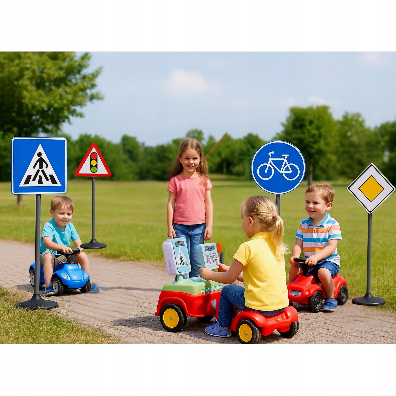 - Zestaw zawiera znaki: przejście dla pieszych, droga dla rowerów, sygnalizacja świetlna, ruch okrężny, droga z pierwszeństwem przejazdu