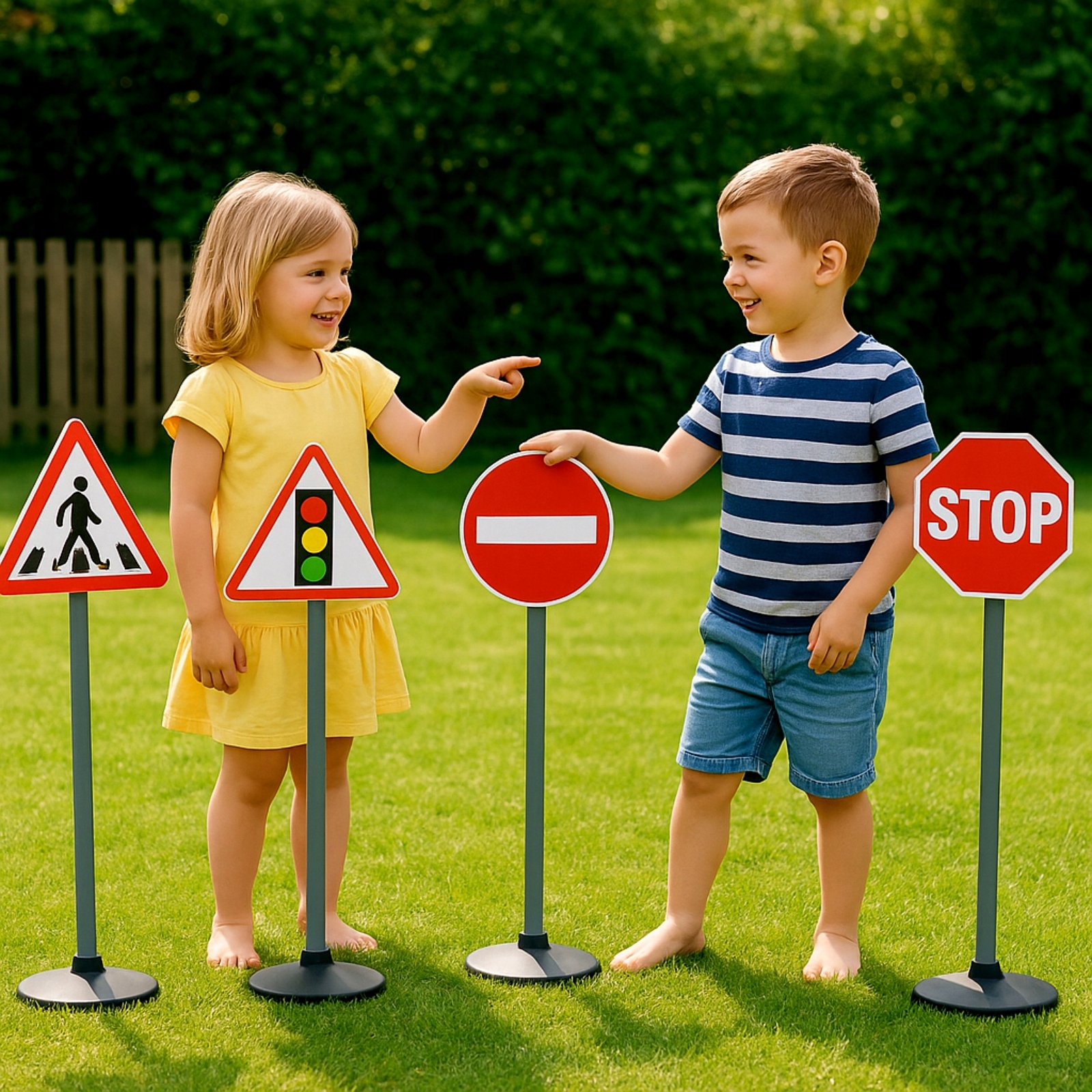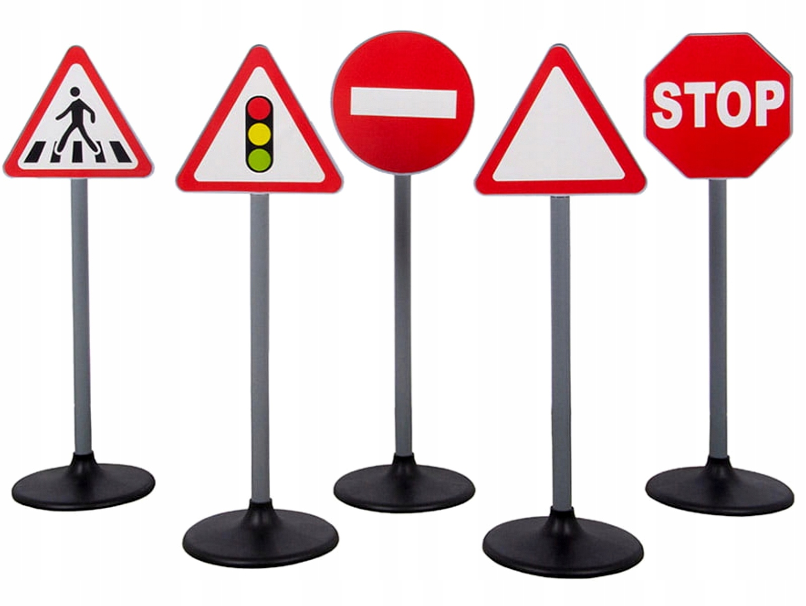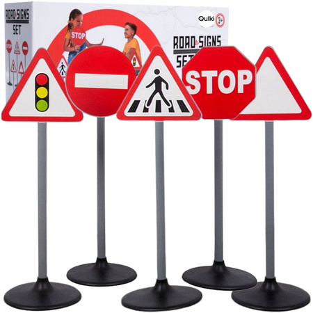 - Zestaw zawiera znaki: stop, zakaz wjazdu, trójkąt ostrzegawczy, przejście dla pieszych, sygnalizacja świetlna