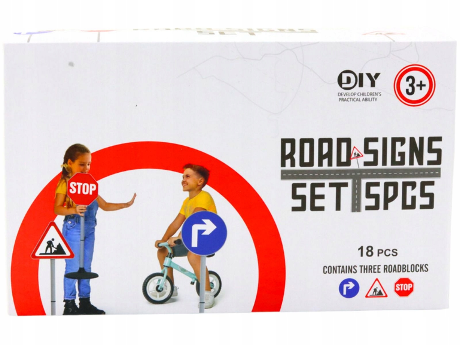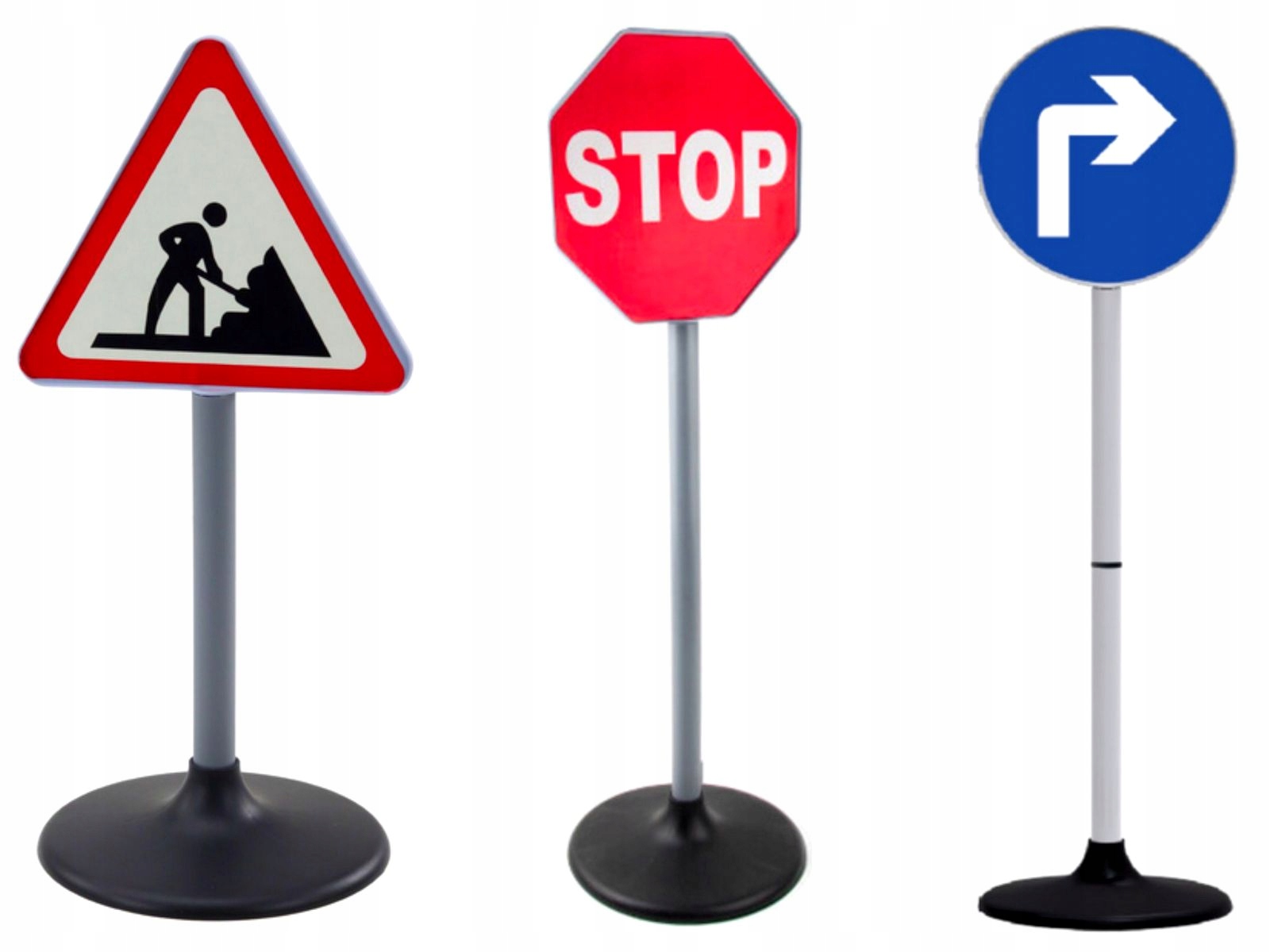 - Zestaw zawiera znaki: stop, nakazu jazdy w prawo, roboty drogowe